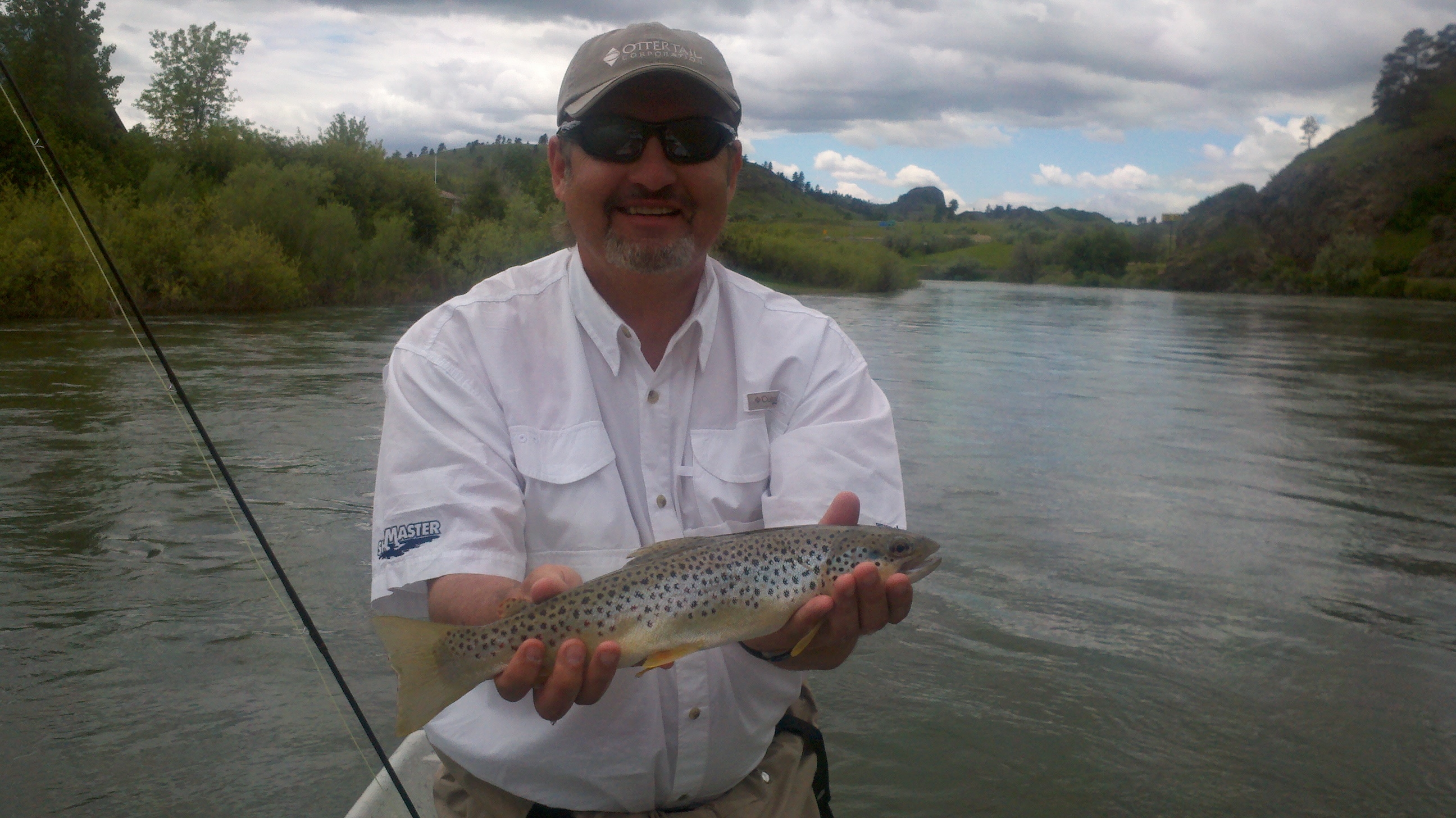 By the time we broke for lunch, we had almost already equaled our catch of the previous day. BD’s crawfish was producing best, but we also caught some nice thick piggies on San Juan worms and #20 pmd nymphs. Just before lunch I hooked up with a true oddity for the Missouri, a little 10-inch brook trout, which Dan conjectured had been blown out of one of the Missouri’s feeder creeks. In 25 years of guiding the river, Big Dan said this was only the second brookie he had ever had in his boat. Since brookies are neither indigenous nor exactly welcome in the big river, he offered to dispatch it for us and we accepted the offer. Happy Hour just got that much better.